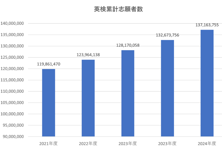 外部検定を入試で活用する大学数の増加とともに、英検の受験者数も年々増加しています。